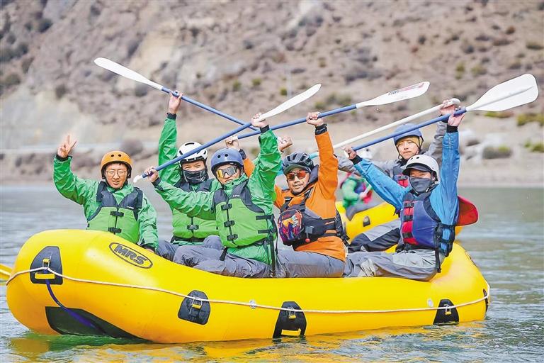 “五一”假期,墨竹工卡唐加乡骑漂行活动举行,近30位户外运动爱好者体验了13公里骑行、4公里徒步、10公里漂流等项目。图为户外运动爱好者体验10公里漂流项目。记者 鹿丽娟 摄