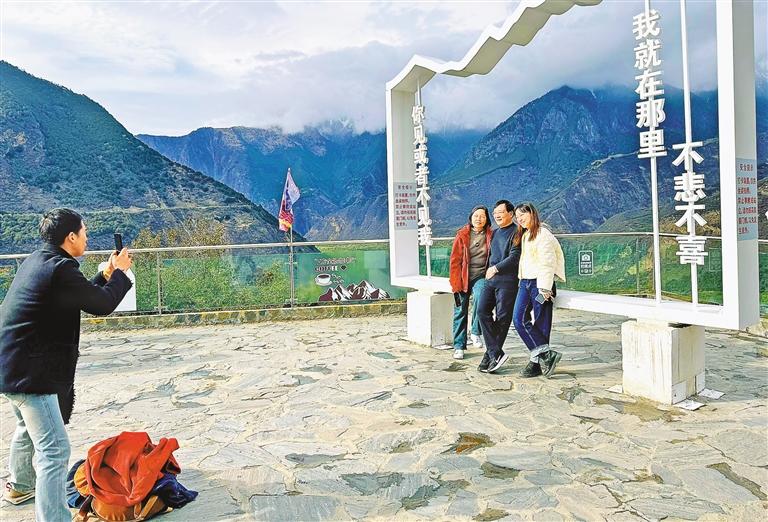 游客在雅鲁藏布江大拐弯观景台拍照留念。记者 白玛泽旺 摄