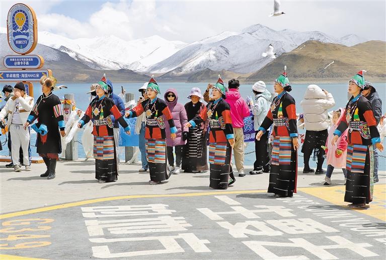 游客在羊卓雍错景区欣赏特色民族歌舞表演。记者 丹增平措 摄
