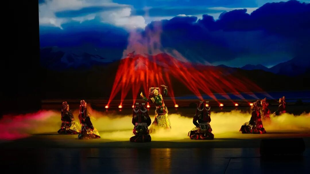主场展演环节更显藏北文化底蕴。演员们身着国家级非物质文化遗产—巴扎传统服饰惊艳登场,服饰上手工刺绣的古朴纹样与银质、铜质精巧配饰相映成趣,独特的褶皱造型与艳丽色彩交织碰撞,尽显藏北服饰独树一帜的艺术魅力。随后上演的《纳仓卓姆舞》,将女性的柔美温婉与藏北草原的雄浑厚重完美融合,舞者循着悠扬长调与铿锵鼓点舒展身姿,时而缓慢旋转变幻,时而双手上举模仿飞鸟翱翔,既展现出对山川万物的虔诚敬畏,也寄托了祈福纳祥的美好愿景,让现场观众深度领略藏北民间舞蹈的深邃文化内涵。