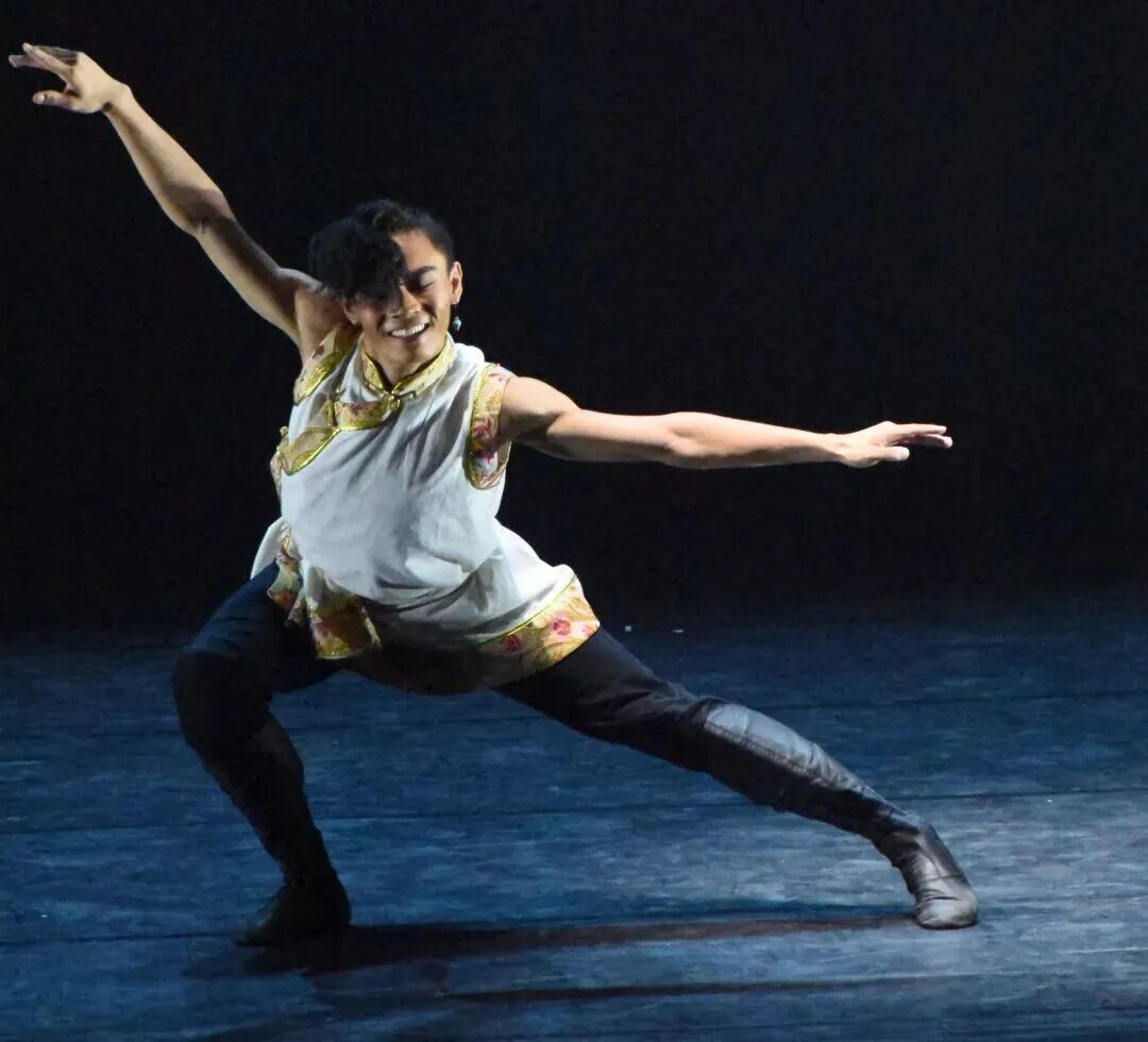 舞台之上,柔和的扎念琴音率先响起,瞬间将观众带入雪域高原的辽阔意境之中。演员加央旦增以沉缓的颤蹲动作入场,膝盖的轻微震颤与琴音形成奇妙共振,坚守了西藏歌舞“膝为根、韵为魂”的艺术本源,又以现代舞特有的沉坠感,勾勒出高原的空旷与静谧。“堆谐”舞蹈快速灵巧的屈伸特征在演员的动作中得到充分体现,下肢的灵活屈伸与上身的平稳姿态形成鲜明对比,完美契合“下身快速灵巧、上身平稳大方”的规律。随后,阔步前进与躺身动作的调度交替出现,急缓相生,肢体线条在舒展与紧张之间灵活切换。他的手臂以流畅的波浪式挥舞,精准模拟出扎念琴的旋律轨迹,指尖的灵动仿佛在空气中拨动琴弦,现代舞的肢体延展与西藏传统歌舞的沉稳内敛形成微妙呼应,韵味悠长。