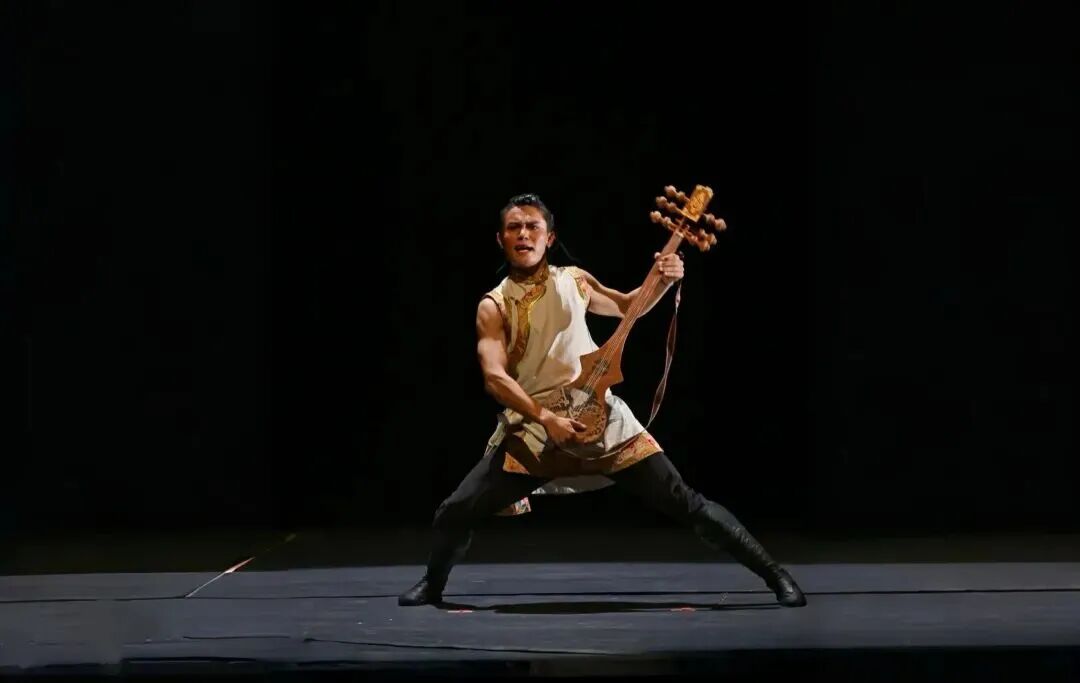抱琴阶段,演员以撤步转身、侧身回望的动作调度,将目光投向象征着艺术信仰的“扎念琴”。其肢体动作沉稳有力且张力饱满,背部挺拔如松,手臂环抱的姿态,通过精准的舞蹈语言传递出对琴的珍视与敬畏。在反复相看的细节动作中,头部转动与眼神聚焦精准配合,形成“上动下稳”的技术平衡,既贴合“堆谐”舞蹈“上身平稳”的特质,又让情感层次从最初的试探,逐步过渡到遇见知音般的欢喜,最终归于笃定,展现出演员极强的肢体控制力与丰富细腻的情感表达能力。