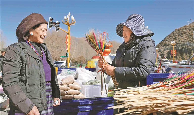 随着春节和藏历新年的临近,墨竹工卡县年货市场进入“红火模式”,五彩“塔脚”、吉祥切玛盒、酥脆卡塞等年货琳琅满目,甜蜜糖果、新鲜水果等商品一应俱全,各族群众穿梭其间精心挑选,处处洋溢着热闹的节日氛围。