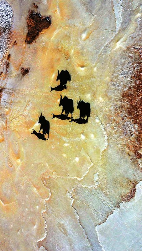 1月15日清晨,雪后初霁,海拔4100米的四川省甘孜藏族自治州石渠县高原草甸气温已经降到了零下15℃。雪色中,一群体格健壮、顶着巨大犄角、披着厚实皮毛的野牦牛出现在天际,如同原始图腾一般印在了那里。