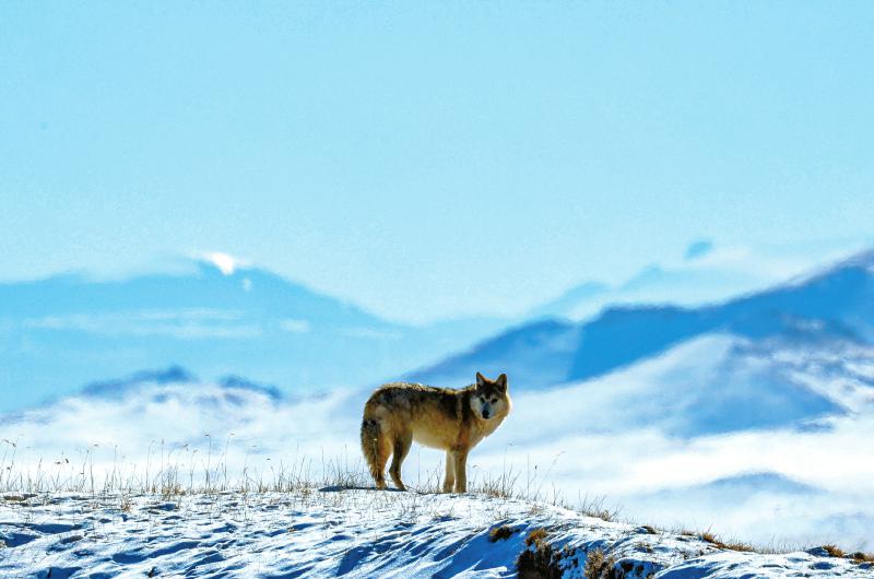 2021年1月13日,珍稀动物高原狼现身青藏高原自然保护区的山脊。