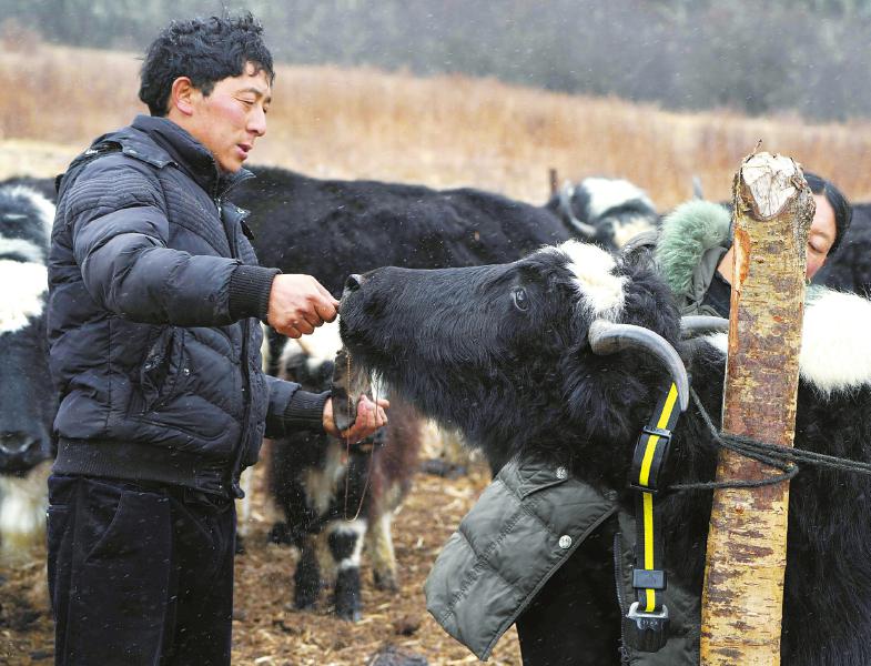 2019年12月11日,木里县海拔3660余米的鸭嘴牧场,牧民龙布泽仁为自家的牦牛戴上高科技项圈。