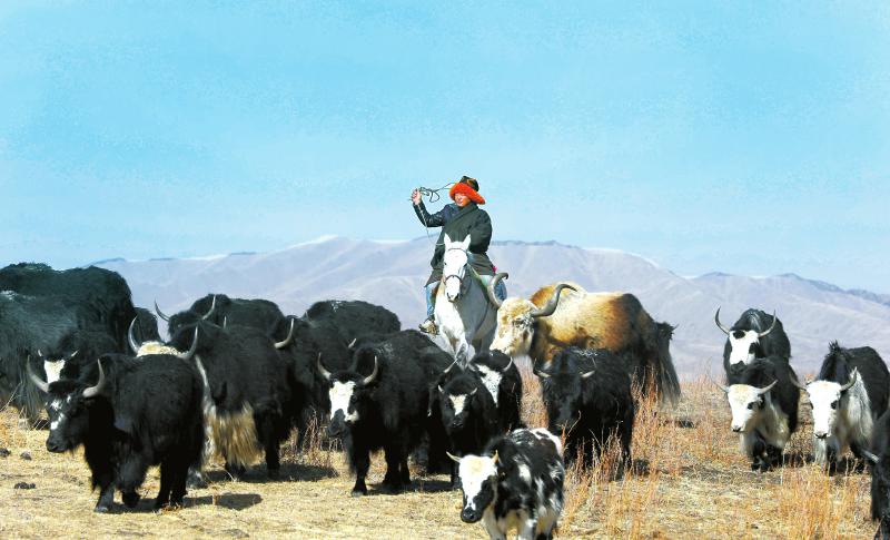 2017年2月9日,红原县瓦切镇瓦切五村的泽尔多正赶着牦牛在冬季牧场放牧。他家共养了200头牦牛,一年出栏20头,是当地远近闻名的靠牧业致富的“能人”。