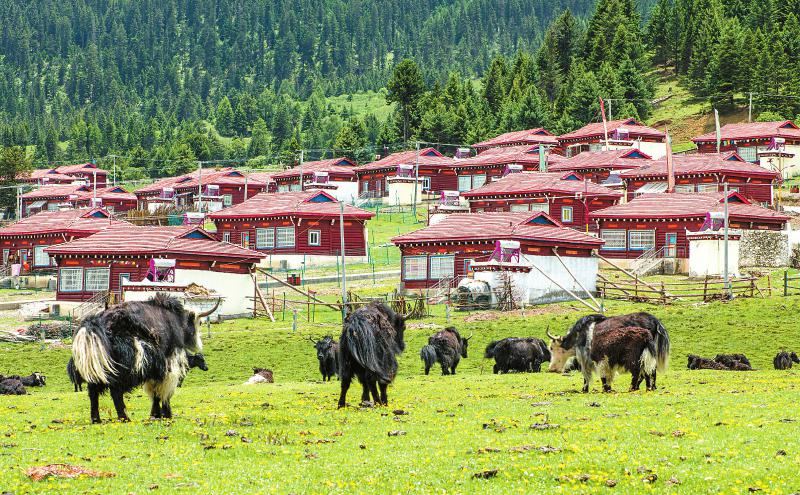 2019年6月21日,道孚县龙灯乡拉日村,夏季牧场上的牦牛和新居构成恬静的田园风光。