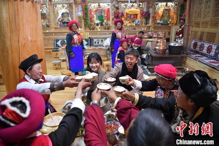 图为格桑卓玛与大家一起享丰盛的藏餐。中新社记者 刘冉阳 摄