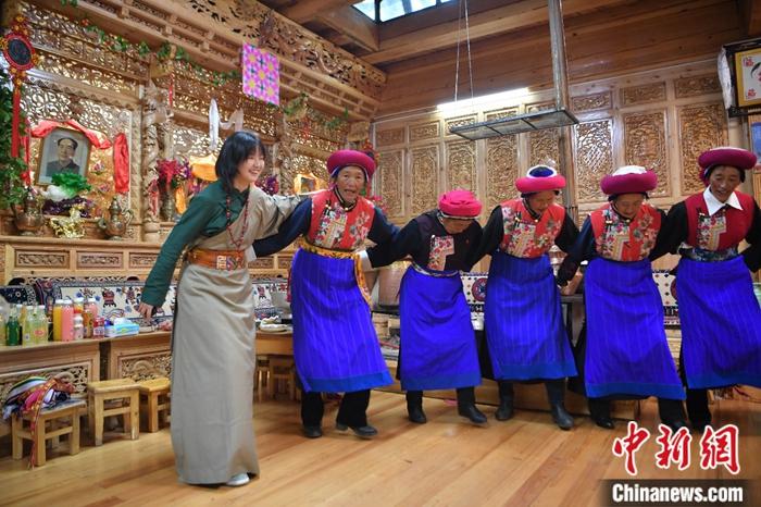 图为穿上藏装的格桑卓玛(左二)在村里与长辈们聊天。中新社记者 刘冉阳 摄