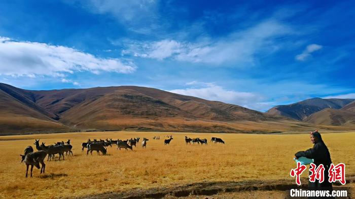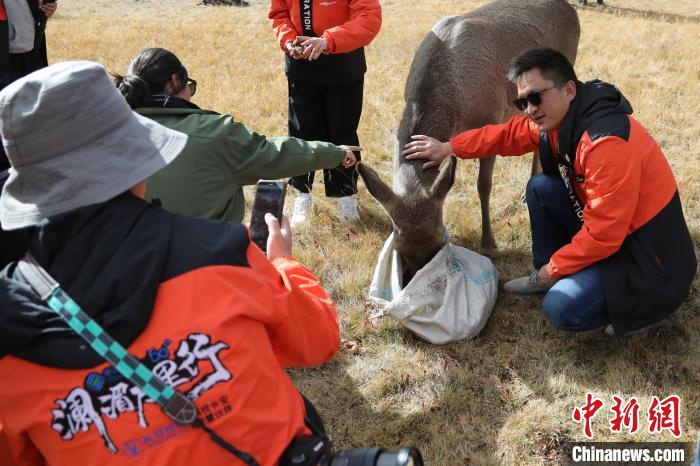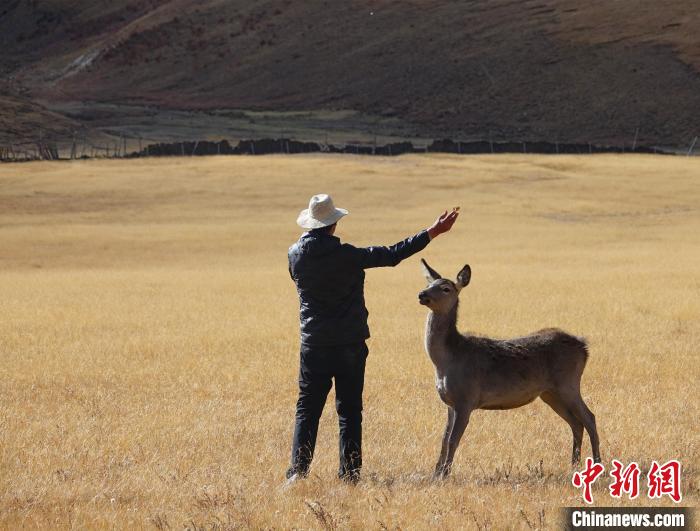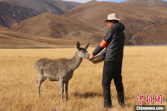 图为西藏类乌齐马鹿国家级自然保护区的管护员正在饲喂马鹿。冉文娟 摄
