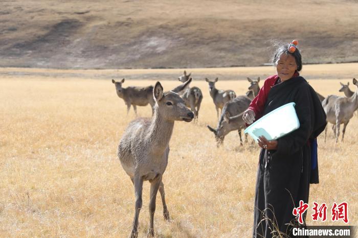 图为和马鹿打了一辈子交道的藏族阿妈向秋拉姆正在喂食马鹿。冉文娟 摄
