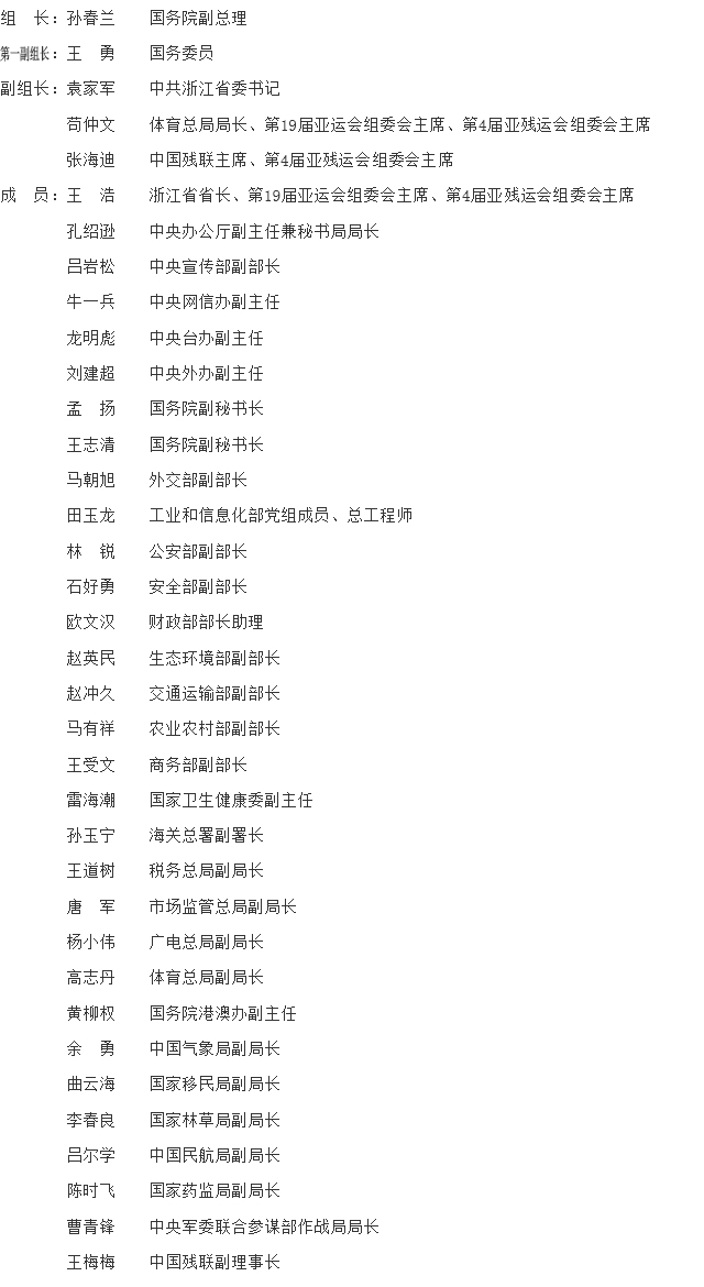 为做好第19届亚运会和第4届亚残运会筹办工作,经国务院同意,成立第19届亚运会和第4届亚残运会工作领导小组(以下简称领导小组)。现将有关事项通知如下: