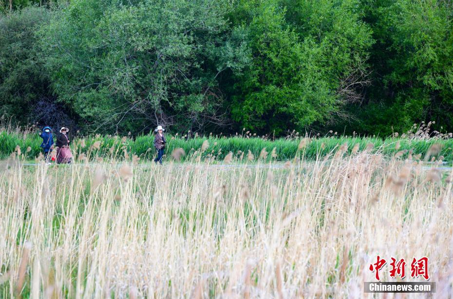 5月24日,拉萨市民沿拉鲁湿地步道观赏游玩。拉鲁湿地国家级自然保护区位于西藏拉萨市北郊,被誉为“拉萨之肺”。 中新社记者 贡嘎来松 摄