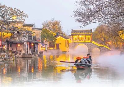 在中国历史文化名镇——浙江省绍兴市安昌古镇,古民居在灯光和雾霭的烘托中,充满水乡诗意。高洁摄(人民视觉)