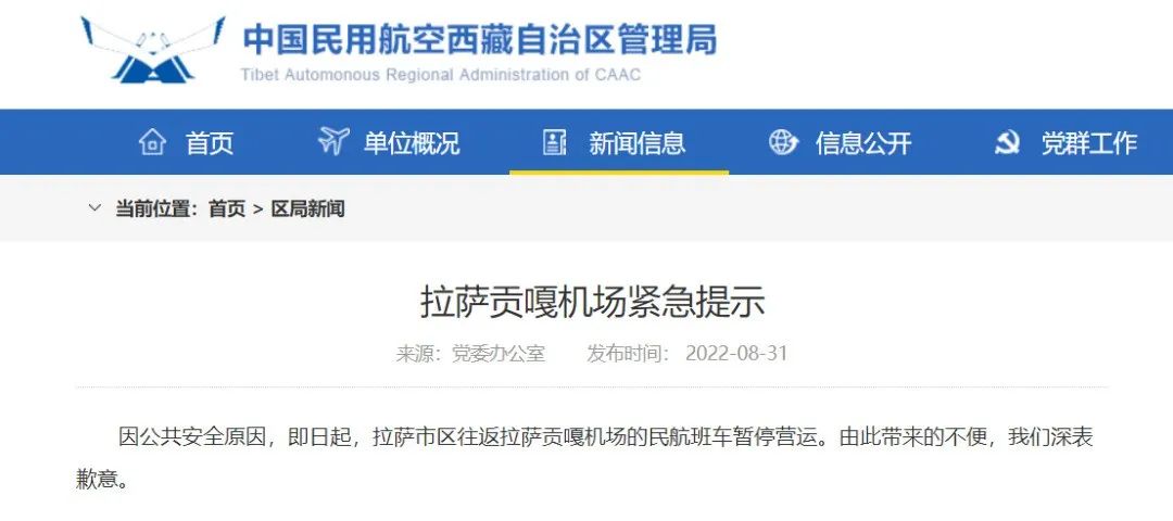 因公共安全原因,即日起,拉萨市区往返拉萨贡嘎机场的民航班车暂停营运。由此带来的不便,我们深表歉意。