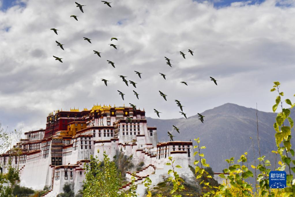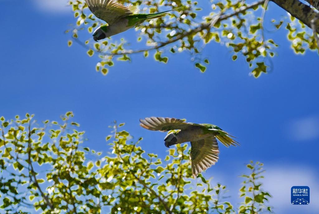 在拉萨市,大紫胸鹦鹉飞离枝头(10月9日摄)。新华社记者 张汝锋 摄