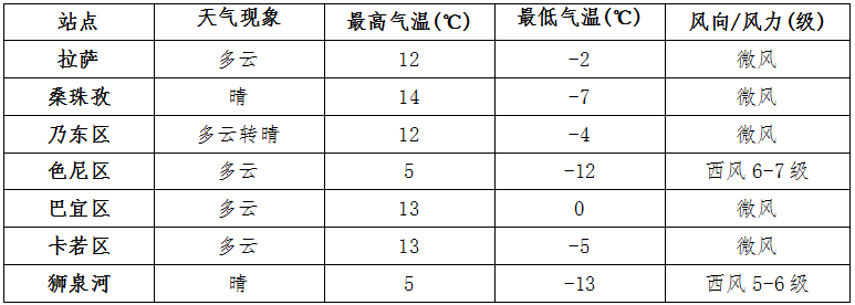 拉萨市区今天夜间到明天白天少云间多云,气温零下2度到13度。空气质量良;早晚体感温度较低,请注意保暖;午后风力较强,户外人员请做好防风措施。明天藏历12月28日
