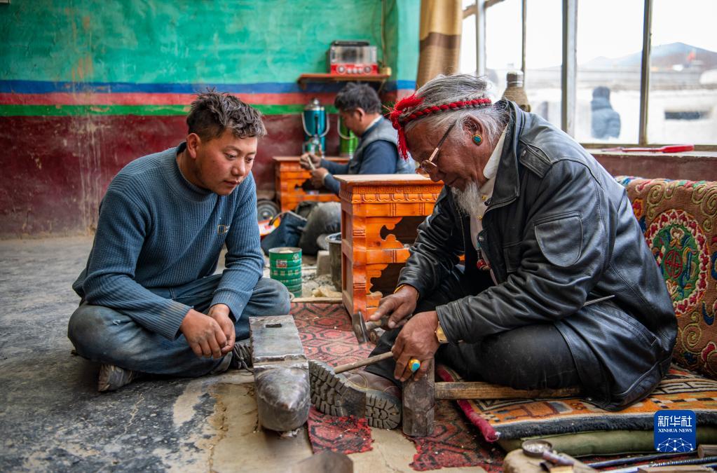 在拉孜县柳乡孜龙村,次旦旺加(右)在指导孙子制作藏刀(3月17日摄)。新华社记者 孙非 摄