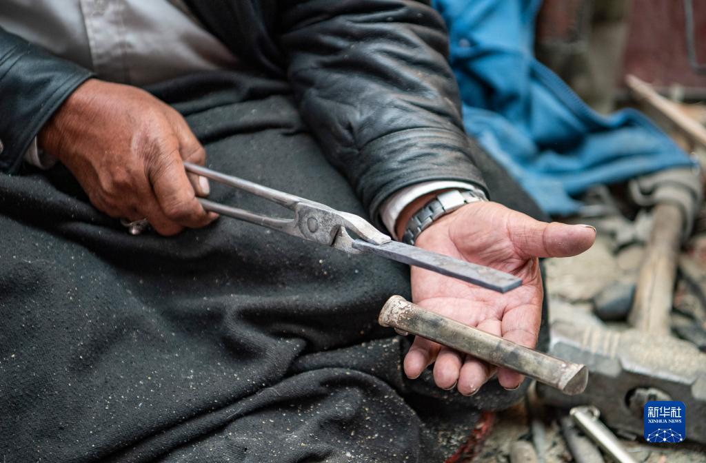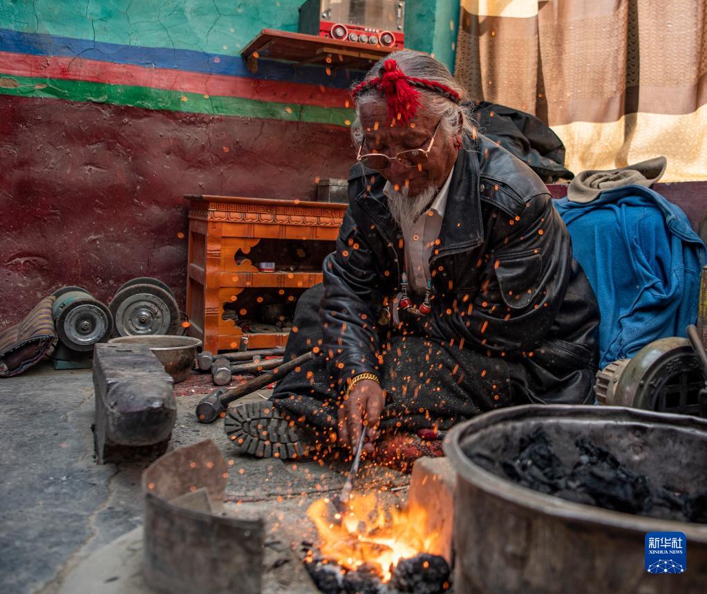 在拉孜县柳乡孜龙村,次旦旺加在制作藏刀(3月10日摄)。新华社记者 孙非 摄