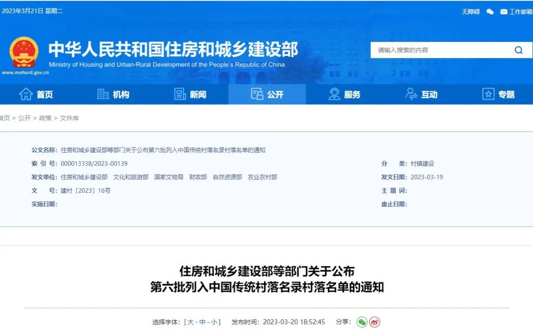 住房和城乡建设部等部门关于公布第六批列入中国传统村落名录村落名单的通知