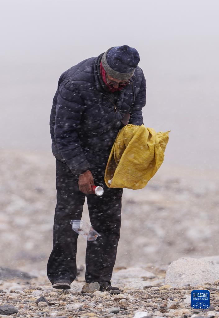 5月31日,乃乃老人在杰玛央宗冰川山口附近捡拾垃圾。新华社记者 邵泽东 摄