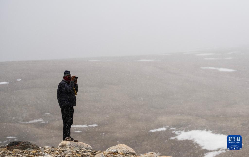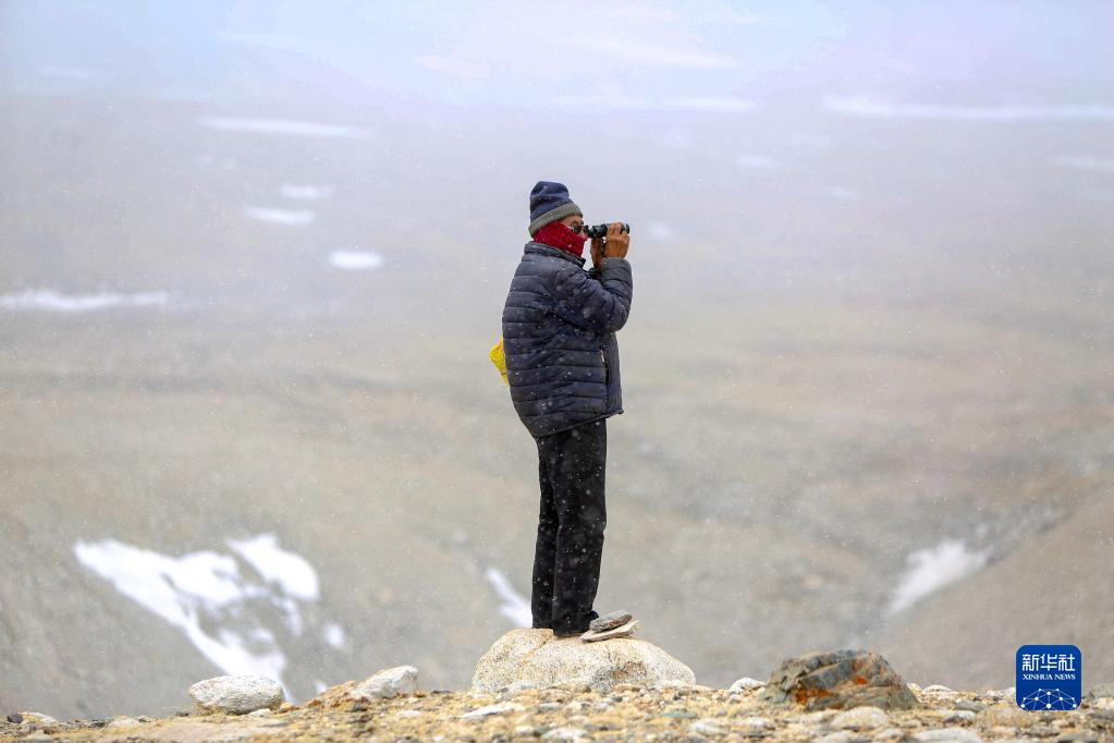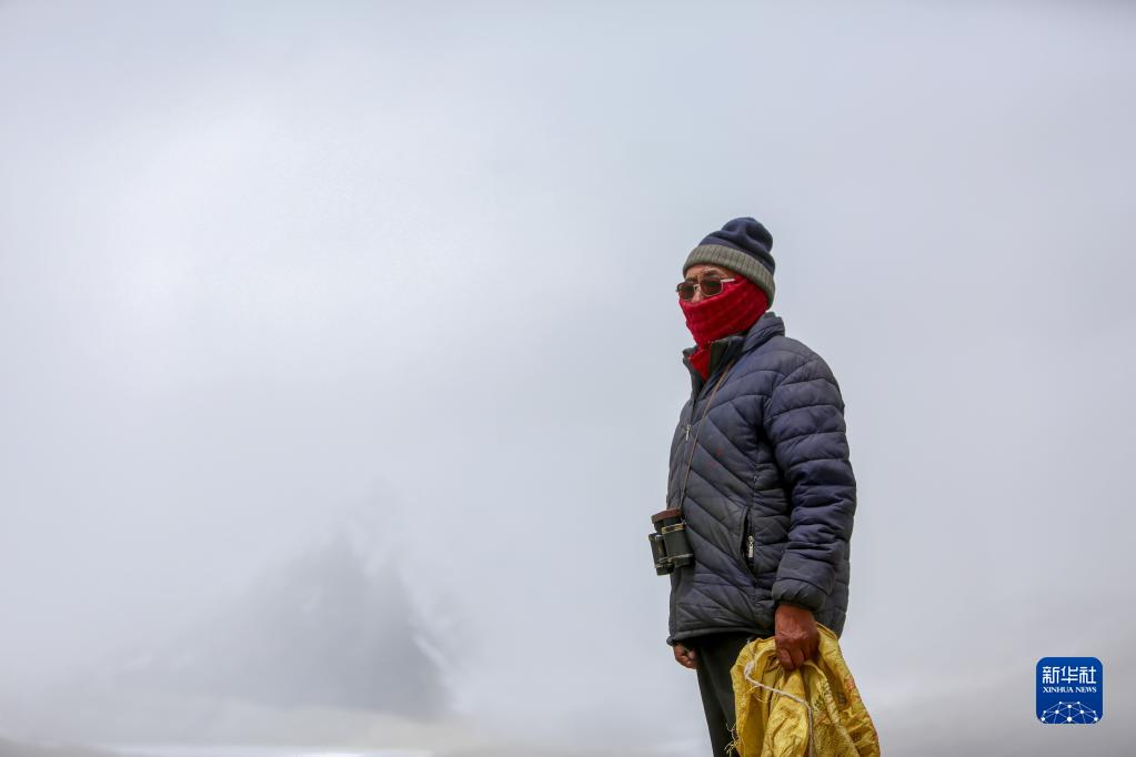 乃乃在用望远镜查看冰川是否有异样(5月31日摄)。新华社记者 晋美多吉 摄