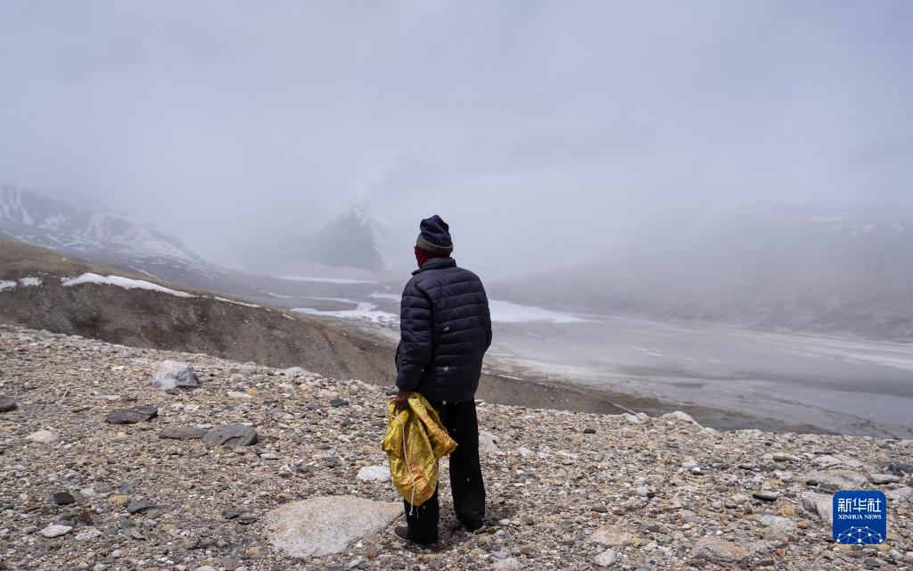 5月31日,乃乃老人凝望着远处的杰玛央宗冰川。新华社记者 费茂华 摄