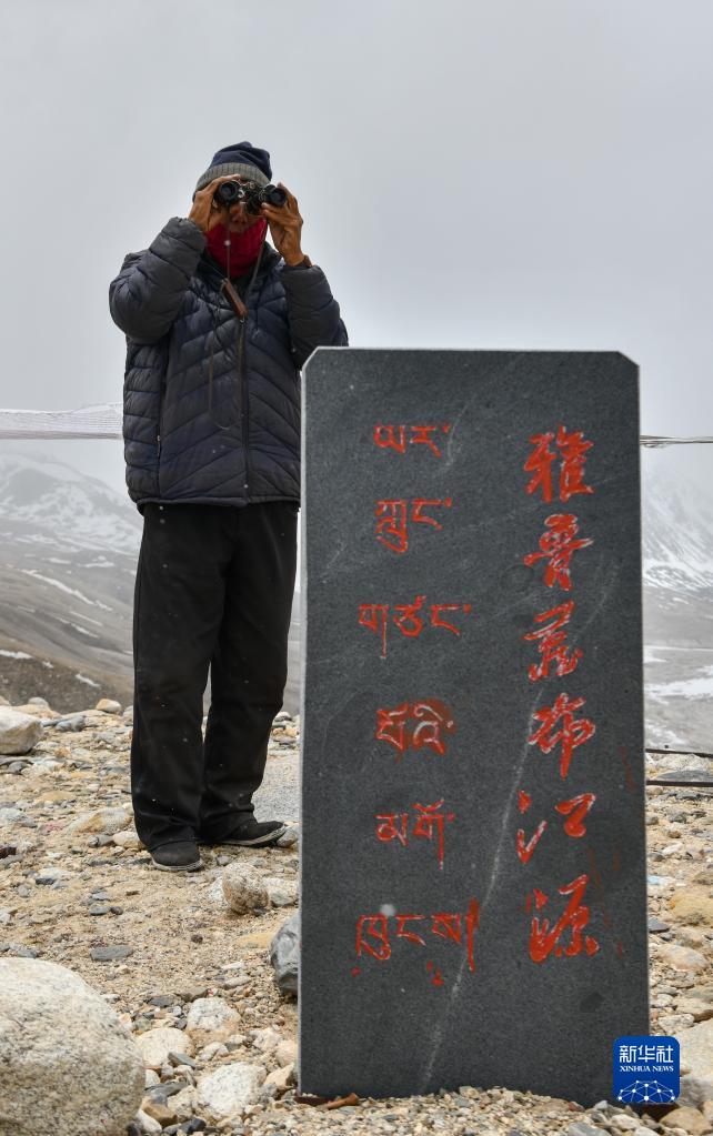 5月31日,乃乃老人在“雅鲁藏布江源”的纪念碑旁留影。新华社记者 费茂华 摄