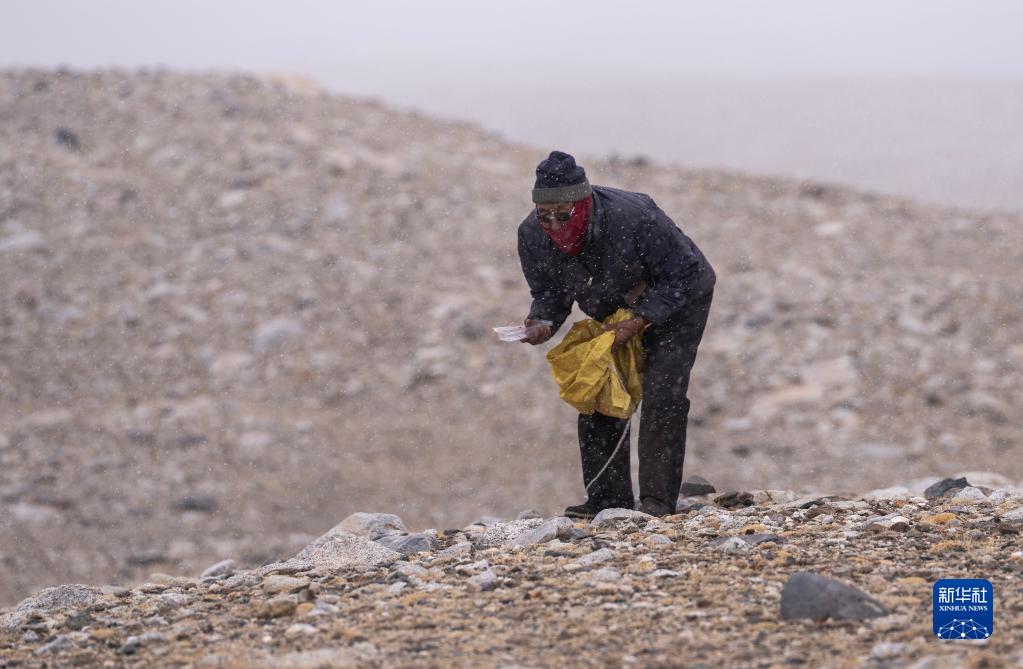乃乃老人静静地、远远地凝视着杰玛央宗冰川,像凝视着好久未见的朋友。随后,老人拎起从家带来的那个黄色蛇皮袋,开始在山口附近捡拾垃圾。冰川附近虽然人迹罕至,但还是有游客留下的瓶瓶罐罐或者被风吹来的塑料袋、纸片……“这附近有二三十户牧民,他们都和我一样爱护环境,”乃乃老人对记者说,“这里是一片净土,是雅鲁藏布江的发源地,对全世界来说都是非常重要的,我能做的就是尽自己努力保护好这里的环境,然后告诉来往的游客要爱护卫生。”