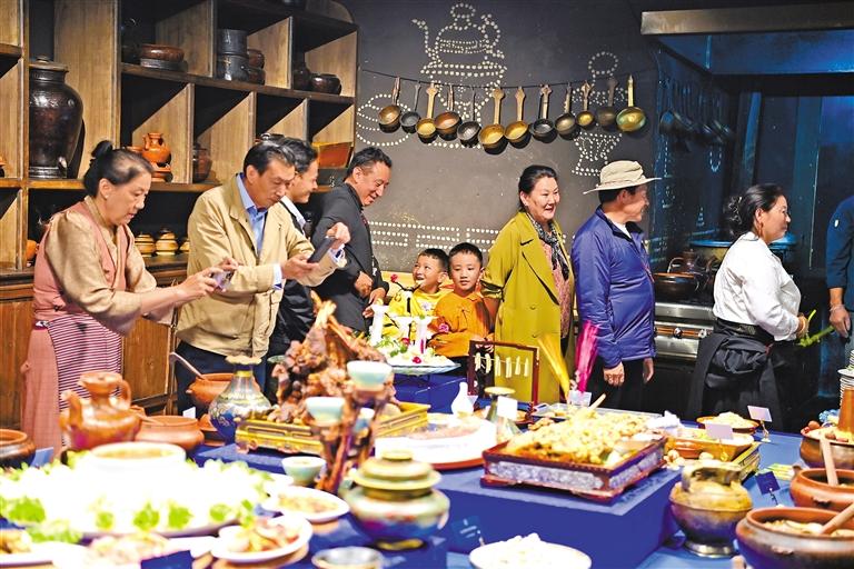 图为市民和游客在拉萨市文化创意园区的彭岜热藏餐厅,参观传统藏餐文化展。记者 旦增西旦 摄