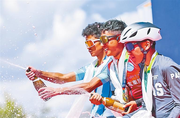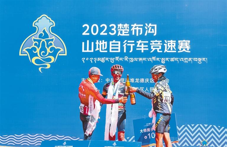 2023年堆龙德庆区宇妥文化旅游演出季·楚布沟山地自行车竞速赛颁奖典礼上,选手在庆祝获奖。