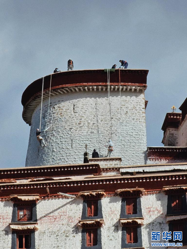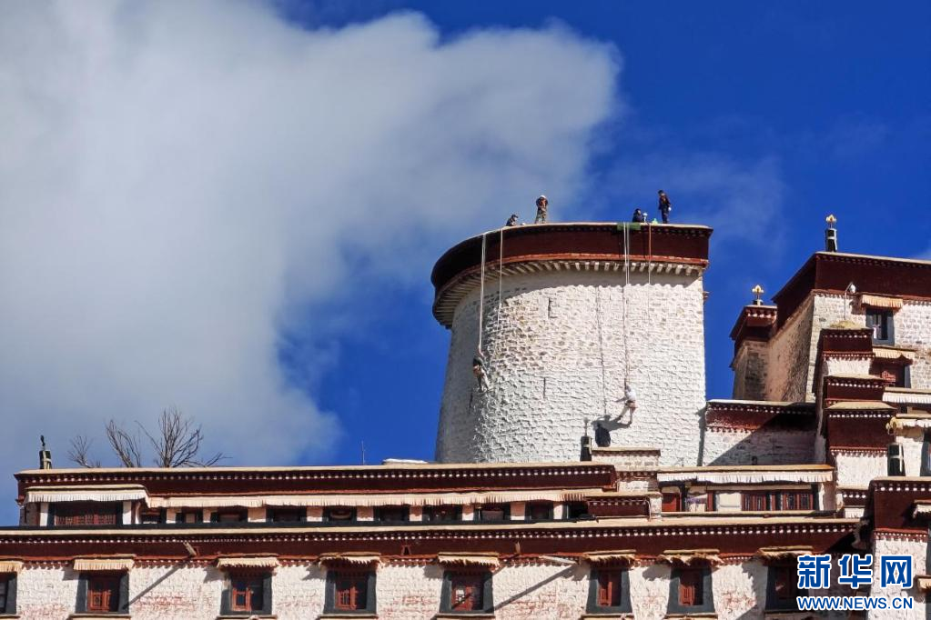 10月18日,布达拉宫“美容师”们在喷洒外墙。新华网 旦增努布 摄