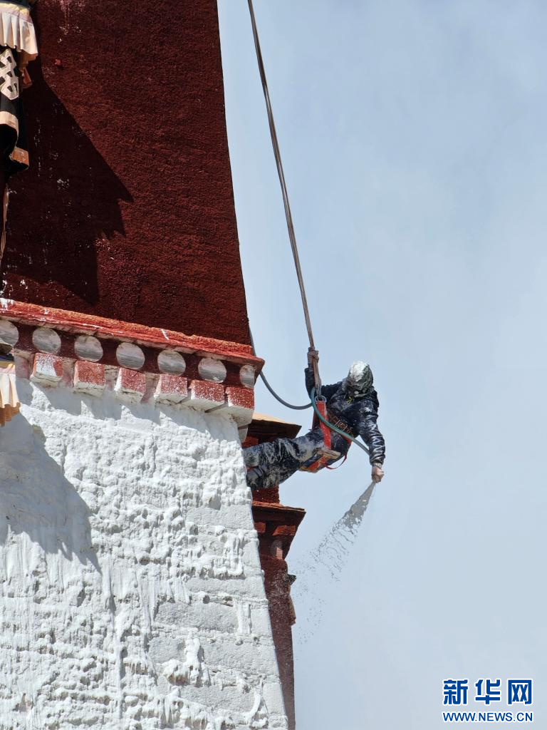 10月18日,布达拉宫“美容师”在喷洒涂料。新华网 旦增努布 摄