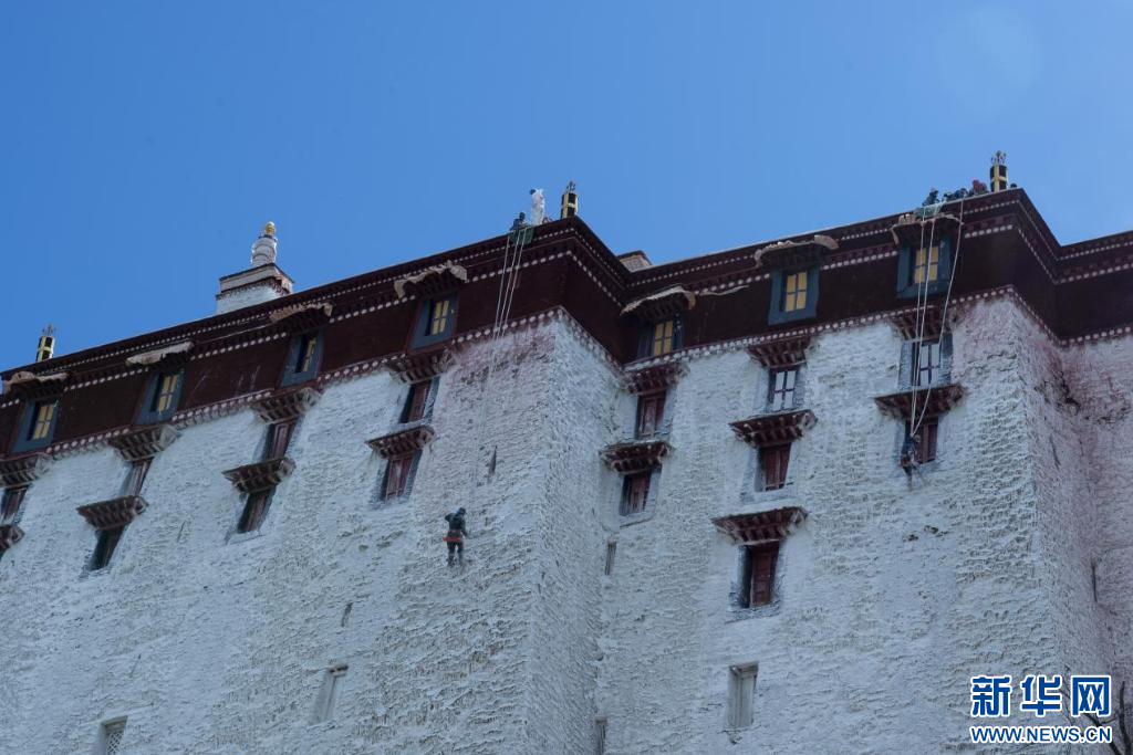 10月18日开始,布达拉宫进入了一年一度的“粉刷季”,数百名群众自发来到布达拉宫参与到“美容”工作中。这些“美容师”们腰间系着长绳,像“蜘蛛人”一样将自己悬在半空,用人工喷洒的方式涂装布达拉宫的外墙。