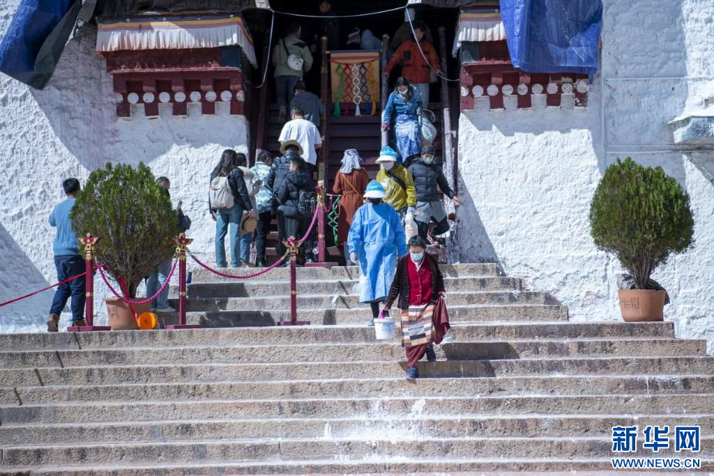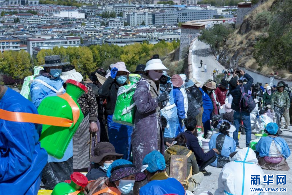 10月18日,布达拉宫“美容师”们在喷洒外墙。新华网 柑丹鸯琦 摄