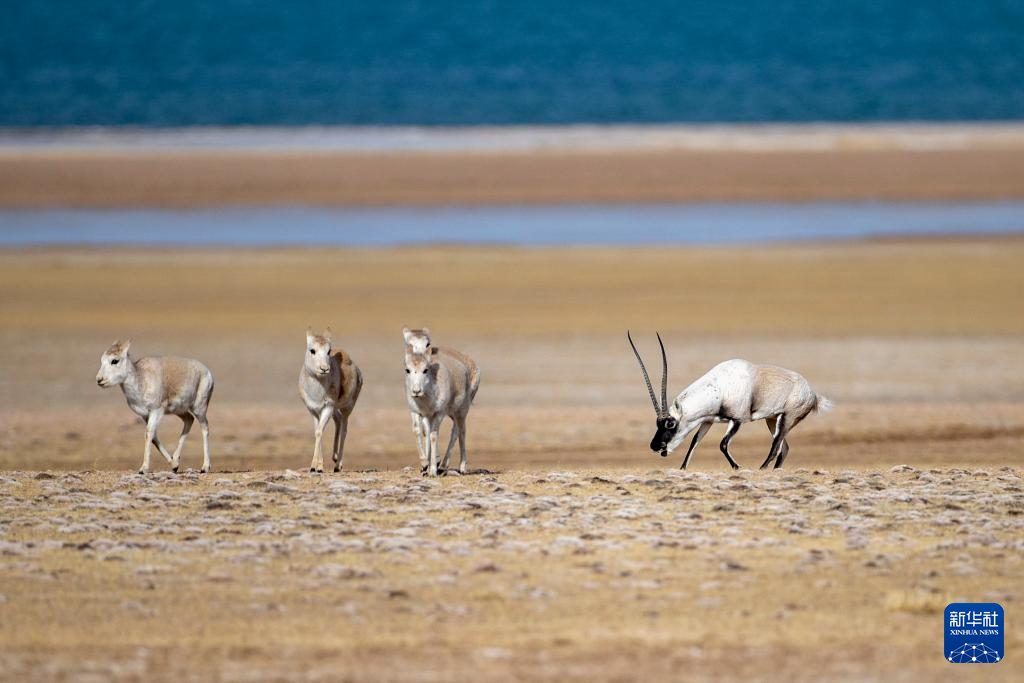 在羌塘国家级自然保护区,一只赢得交配权的雄性藏羚羊守护着自己的“后宫”(12月16日摄)。新华社记者 姜帆 摄