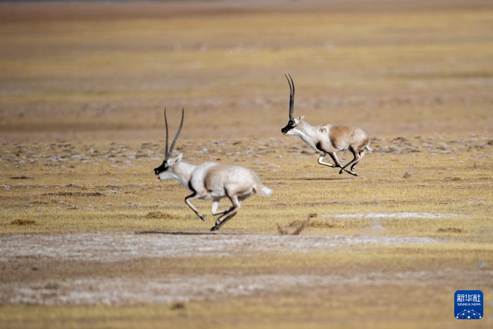 在羌塘国家级自然保护区,两只雄性藏羚羊为争夺交配权而相互追逐(12月16日摄)。新华社发(旦增努布 摄)