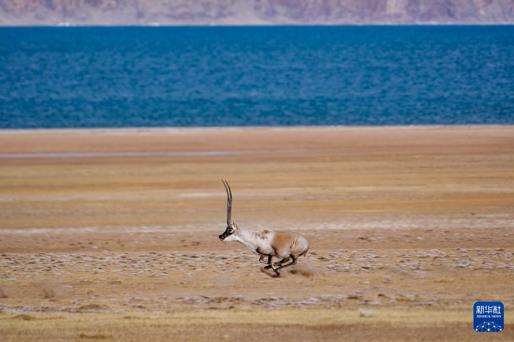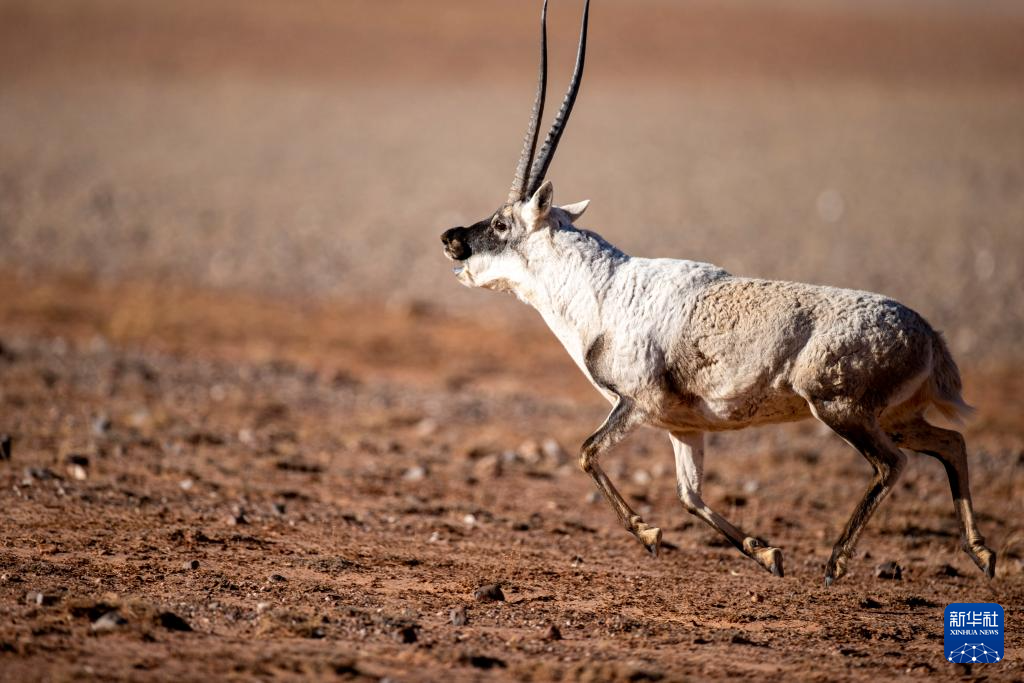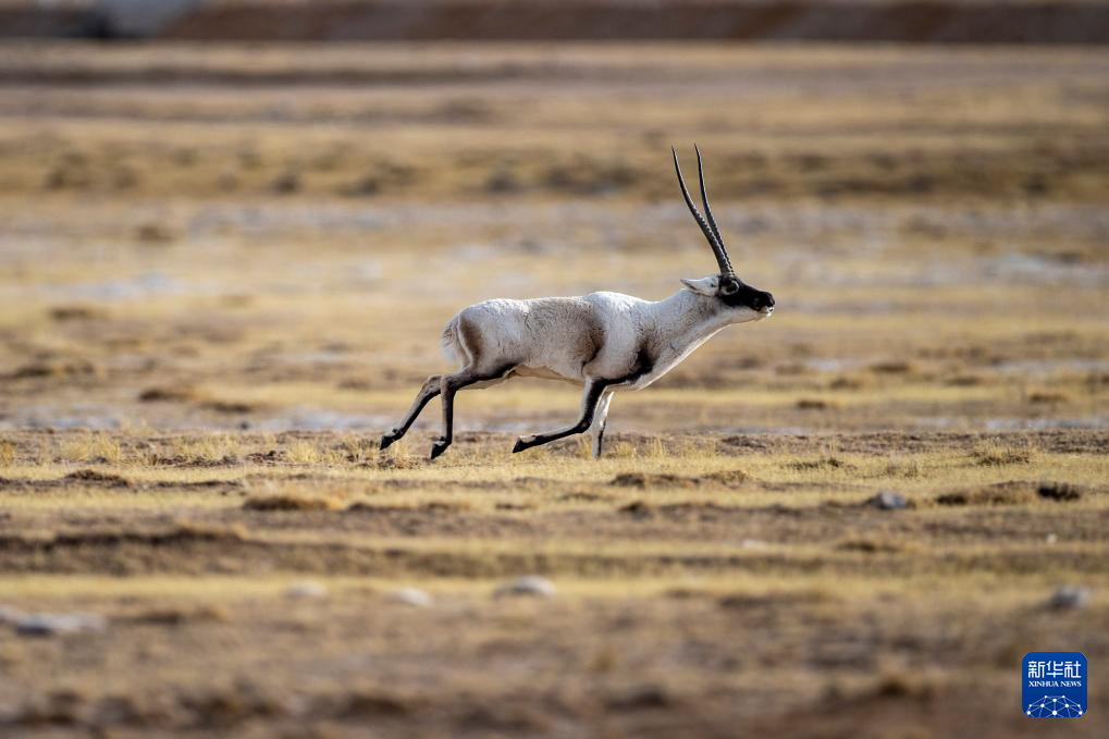 在羌塘国家级自然保护区,一只雄性藏羚羊在奔跑(12月16日摄)。新华社发(旦增努布 摄)