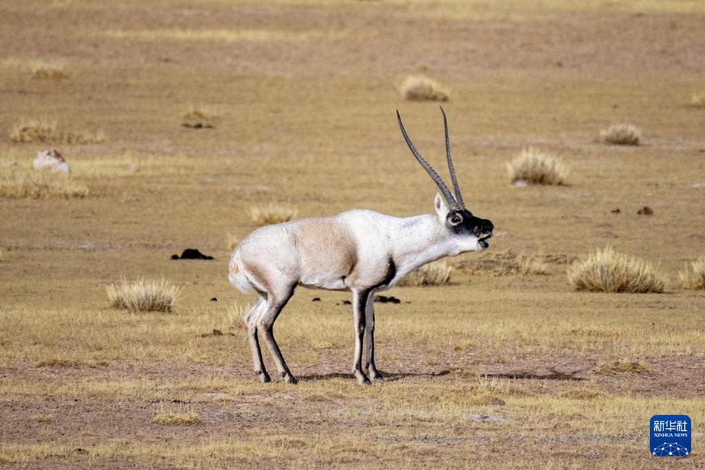 在羌塘国家级自然保护区,一只发情的雄性藏羚羊在“呼唤”雌性(12月16日摄)。新华社记者 姜帆 摄