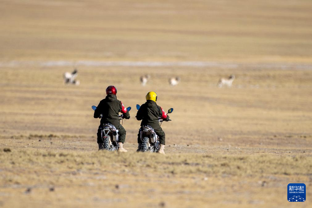 在羌塘国家级自然保护区,野生动物管护队员骑着摩托车观察藏羚羊(12月17日摄)。新华社记者 姜帆 摄