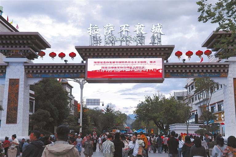 开街首日,藏式灯笼与LED光带将整条街道装点得宛如银河落地,标志着拉萨正式迈入“全域全时旅游”新时代。