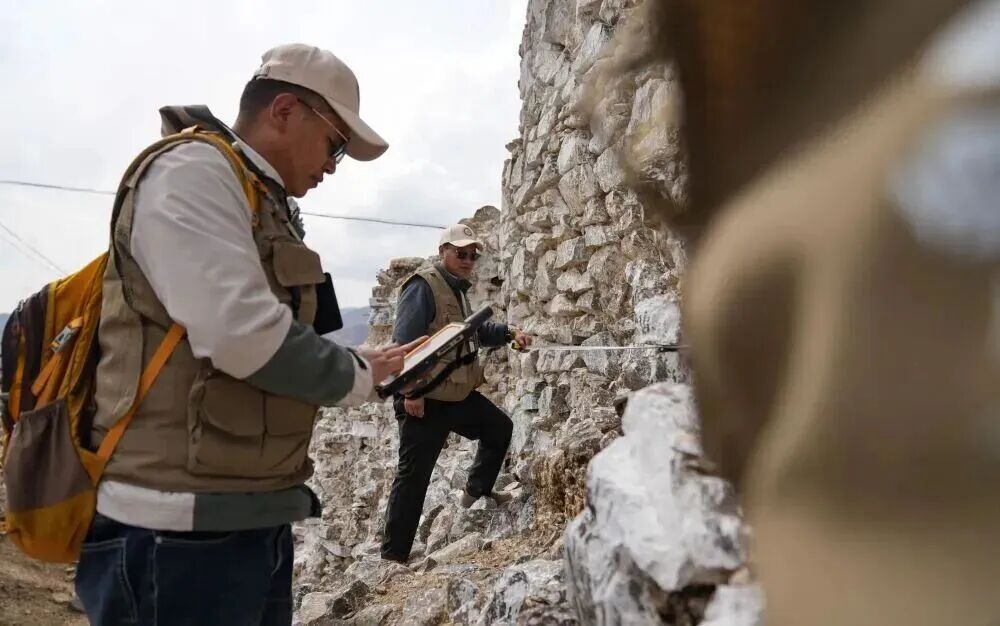 图为普查队员在西藏墨竹工卡县曲果岗塔群遗址现场开展数据采集。(2024年4月11日 摄) 新华社记者 晋美多吉 摄