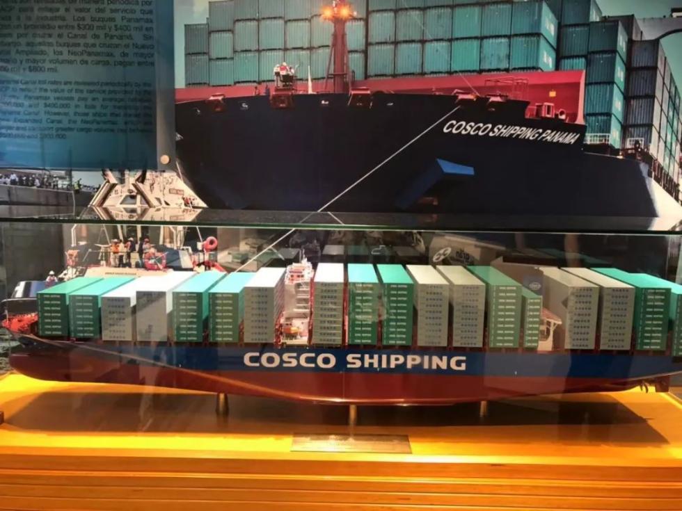 科科利船闸于2016年6月26日正式投入使用。首艘通过新船闸的船舶是中远海运巴拿马号。这是首船的模型图和实景图。(央视记者谢晓光拍摄)