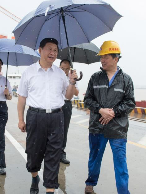 早在2013年7月,习近平就曾冒雨考察武汉新港阳逻集装箱港区。在考察港口运作流程时,听到设备技术水平是内陆港口最先进的,习近平脸上露出笑容。