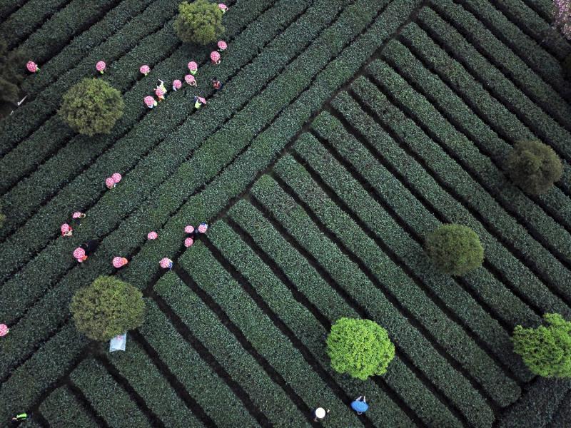 2018年4月1日,孩子们在贵州省遵义市湄潭县湄江街道核桃坝村体验采茶(无人机拍摄)。 来源:新华社