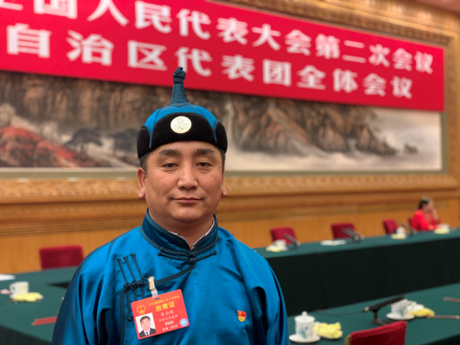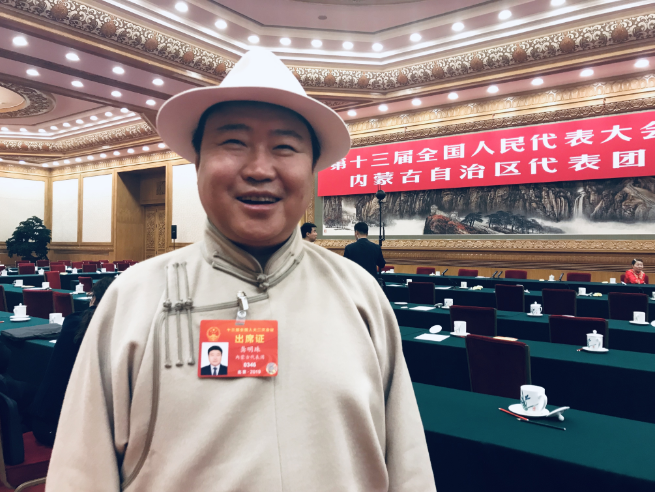 习近平走进会场后,鄂温克族代表梅花向他献上了蓝色的哈达。这是梅花代表。(央视记者张晓鹏拍摄)
