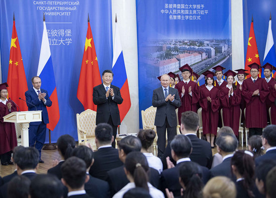 当地时间6月6日,又一场特殊仪式在圣彼得堡国立大学举行。习近平被授予圣彼得堡国立大学名誉博士学位。他在答辞中说道,这既是双方教育和人文领域密切交流的例证,更是中俄关系高水平的重要体现。他同时希望双方不断扩大教育领域交流合作。