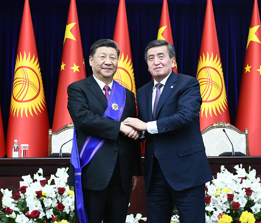 6月13日,在吉尔吉斯斯坦首都比什凯克,习近平出席仪式,接受了吉尔吉斯斯坦总统热恩别科夫授予的吉尔吉斯斯坦国家最高奖章——“玛纳斯”一级勋章。