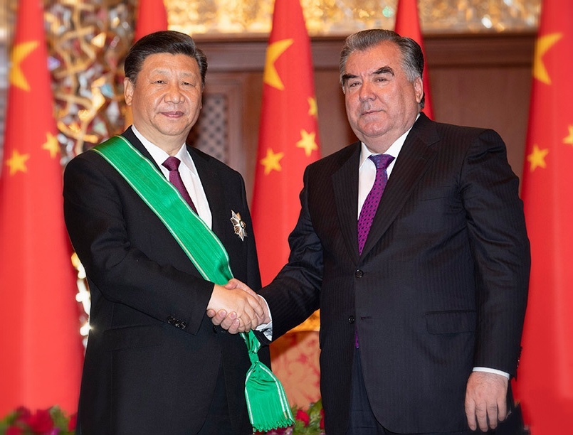 6月15日,习近平主席在杜尚别接受塔吉克斯坦总统拉赫蒙授予的“王冠勋章”。两国总统分别向习主席授予各自国家最高奖章,感谢习近平主席为发展吉中、塔中关系所作的卓越贡献。